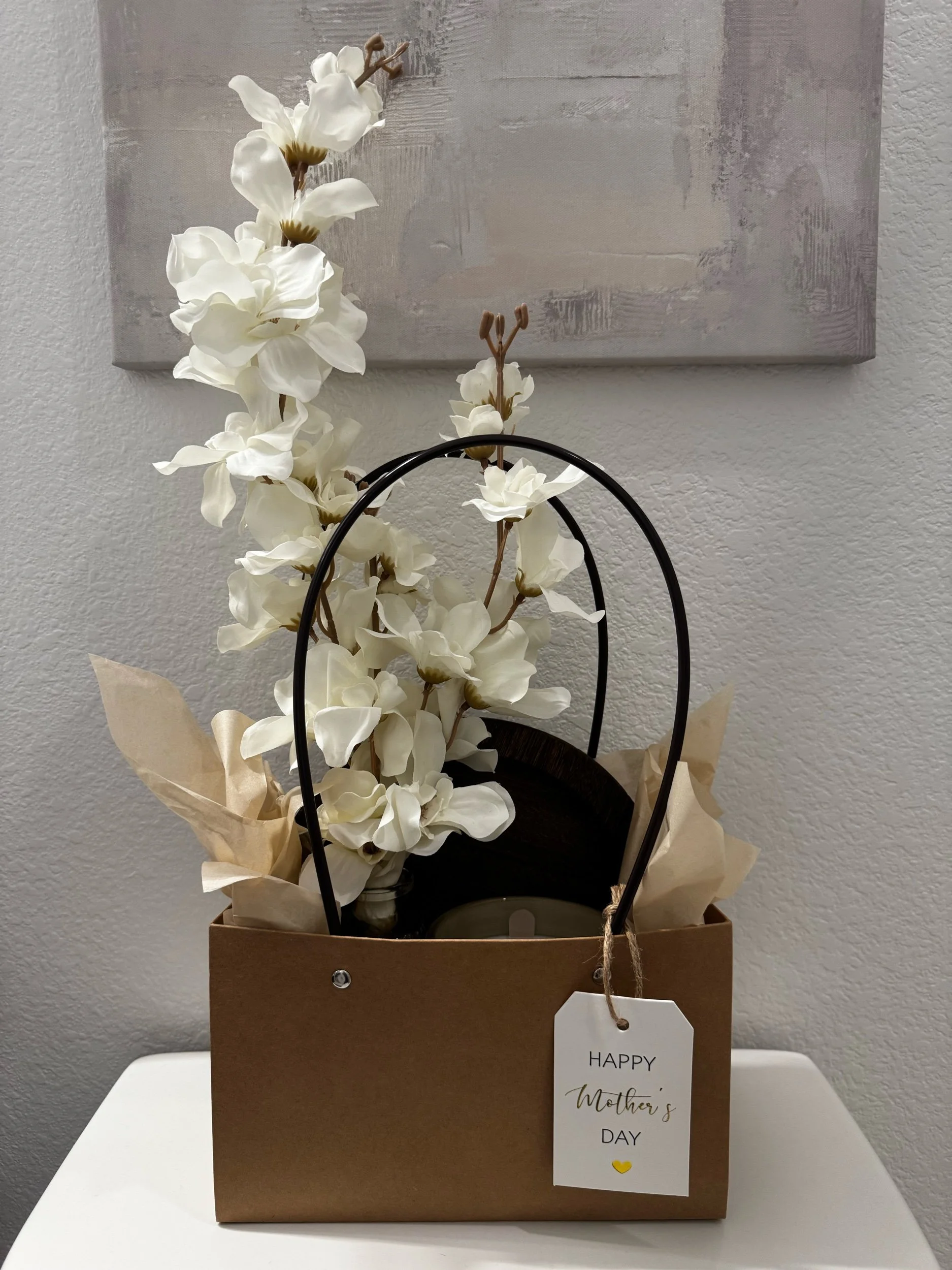 An 8” distressed wood tray holds an 13oz citrus sugar scented candle, bud vase with blooming white Delphinium, and a jar of white tip matches with striker. The perfect sized decor for any counter, back of toilet or nightstand. Beautifully packaged in a kraft bag with dark brown handles and Happy Mother’s Day tag with jute rope.